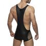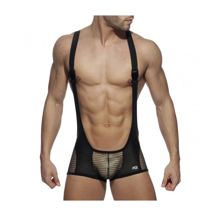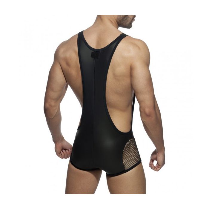 Dit kledingstuk is vervaardigd uit zwart stretchmateriaal dat niet alleen een spannende lederlook biedt, maar ook perfect aansluit op je lichaam voor een flatterende pasvorm. De unieke buidel en de delen op de dijen zijn gemaakt van 3D glitter mesh met een grof gatenstructuur, wat zorgt voor een verleidelijke uitstraling die je zelfvertrouwen een boost geeft.