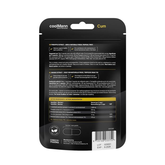 Voeg CoolMann Cum toe aan je dagelijkse routine en ervaar de voordelen van verhoogde vruchtbaarheid en een verbeterde climax. De synergistische werking van de ingrediënten zorgt ervoor dat je je zowel fysiek als mentaal op je best voelt.