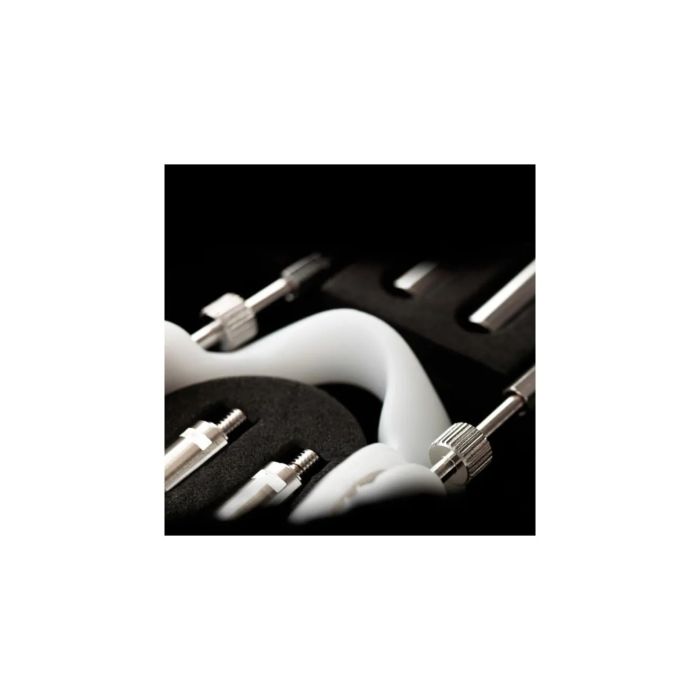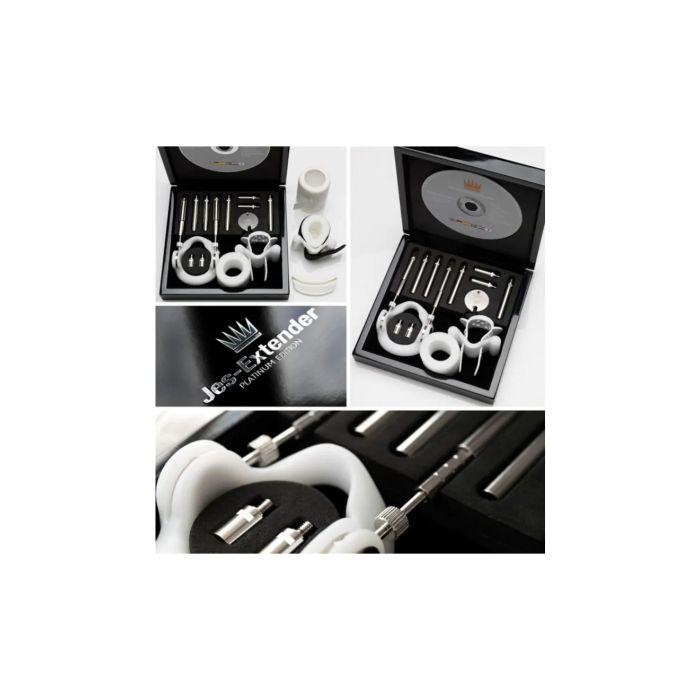Het complete pakket van de Jes-Extender Platinum bevat alles wat je nodig hebt voor een comfortabele en effectieve ervaring. Je ontvangt een basiseenheid, een dual-function front piece, een siliconen buis, een comfortstrap en een scala aan elongatiebalken in verschillende lengtes (vier van 5 cm, twee van 2.5 cm en twee van 1.25 cm). Daarnaast zijn er een beschermpad, een set sleutels, cohesieve gaas en een Softattach inbegrepen, evenals een op maat gemaakte klittenbandstrap voor extra comfort.