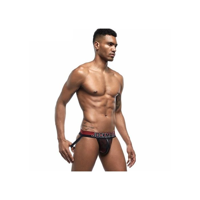 De brede tailleband met een trendy gestreept patroon en het Jockmail-logo zorgt voor een modieuze uitstraling die perfect aansluit bij jouw persoonlijke stijl. Deze jockstrap zit lekker laag op de heupen, waardoor je een verleidelijke look creëert zonder in te boeten op comfort. De elastische banden aan de achterkant tillen je kontje op en accentueren je vormen op een flatterende manier, zodat je er op je best uitziet.