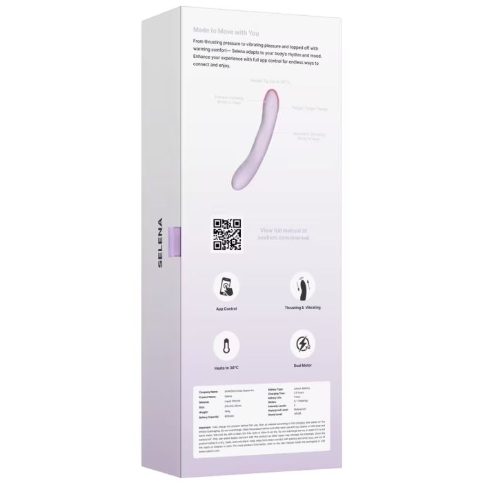 De bediening van de Selena is eenvoudig en gebruiksvriendelijk, zodat je met één druk op de knop je volledige aandacht kunt richten op de ervaring zonder gedoe. Dankzij de krachtige, stille motoren geniet je van discreet plezier, waar je ook bent. Voor nog meer opties kun je de SVAKOM-app op je smartphone gebruiken.