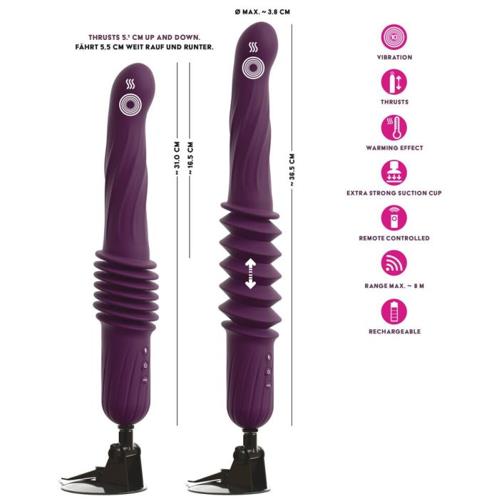 De RC Warming Fucking Machine van You2Toys is een krachtige schokvibrator die je zintuigen op een ongekende manier prikkelt. Dankzij de innovatieve golfstructuren en de afneembare zuigvoet, die je eenvoudig in een hoek van 90° kunt verstellen, geniet je van een handsfree ervaring die je niet snel zult vergeten. Bevestig de vibrator moeiteloos aan elk glad oppervlak en laat je meevoeren door de krachtige stoten en vibraties. Met een slaglengte van 5,5 cm en drie instelbare snelheden kun je de intensiteit perfect afstemmen op jouw persoonlijke voorkeuren. De 10 verschillende vibratiestanden bieden een scala aan mogelijkheden, allemaal eenvoudig te bedienen met de afstandsbediening tot 8 meter afstand of met één druk op de knop op het speeltje zelf.